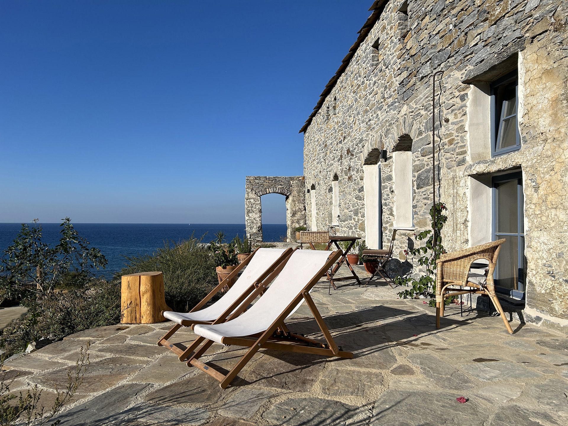 Die gemütliche 2-stöckige Wohnung ist in einem traditionellen ikariotischen Steinhaus, dass an den natürlichen Felsen des Fytema-Tals gebaut ist. Vom Wohnzimmer und vom Schlafzimmer aus hat man einen wunderbaren Meerblick.