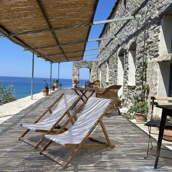 Η πέργκολα δημιουργεί ένα όμορφο σκιερό σημείο μπροστά από το σπίτι, ενώ μια άλλη βεράντα σκιάζεται από μια μεγάλη μπουκαμβίλια και μια συκιά. Οι φυσικοί πέτρινοι τοίχοι του σπιτιού, πάχους έως και ενός μέτρου, διατηρούν ευχάριστα δροσερό το εσωτερικό κατά τους καλοκαιρινούς μήνες, χάρη και στον φυσικό βράχο στο πίσω μέρος. Έτσι δεν είναι απαραίτητος ο κλιματισμός.