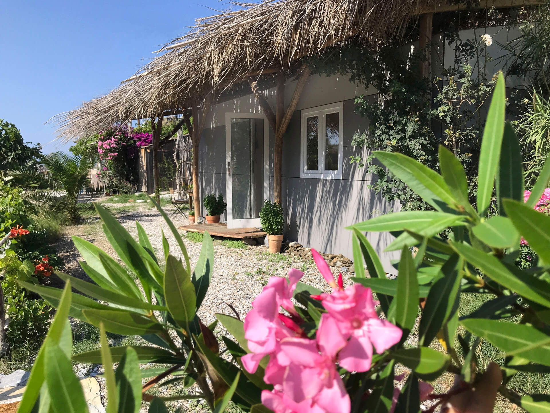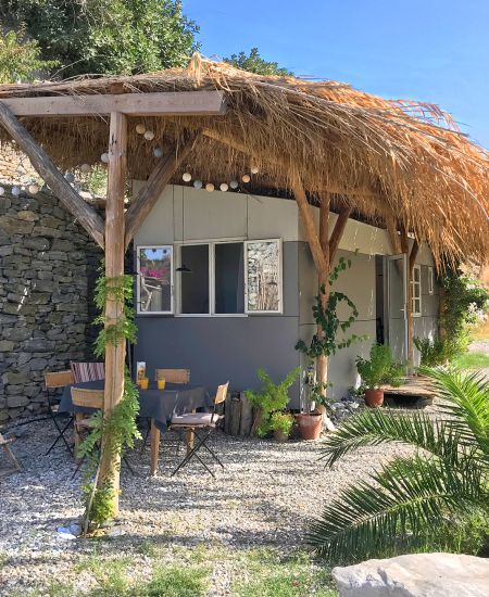 Das moderne, stilvoll ausgestattete Tinyhouse bietet einen umwerfenden Blick auf den Strand und das Tal von Fytema.