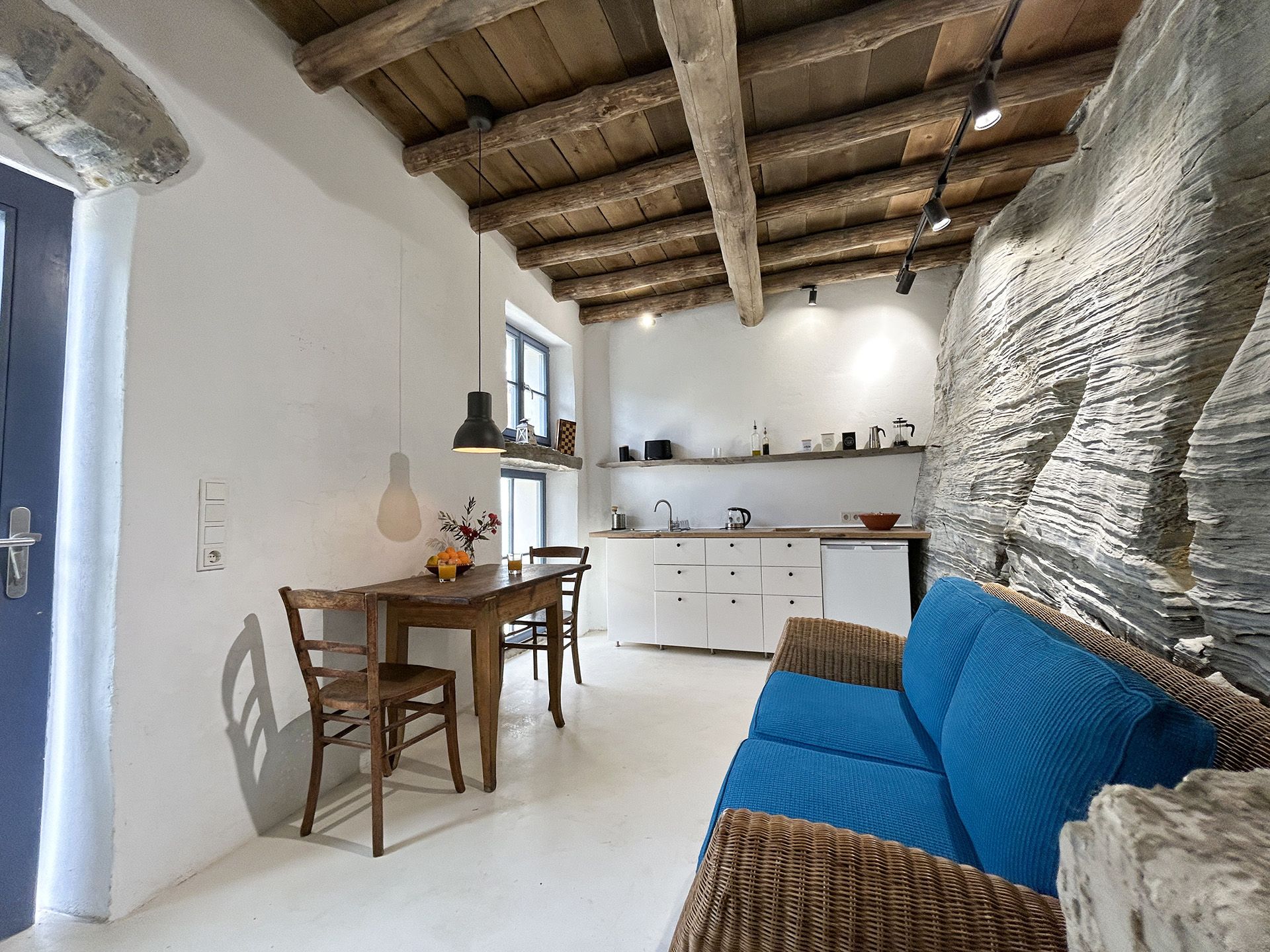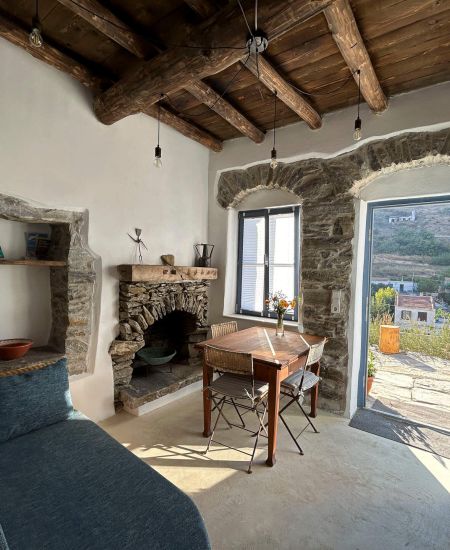 Die geräumige 2-stöckige Wohnung ist in einem traditionellen ikariotischen Steinhaus, dass an den natürlichen Felsen des Fytema-Tals gebaut ist. Mit 35 qm ist sie unsere größte Wohnung. Vom Schlafzimmer aus hat man einen wunderbaren Blick in den Garten und ins Tal in Richtung dem Bergdorf Akamatra.