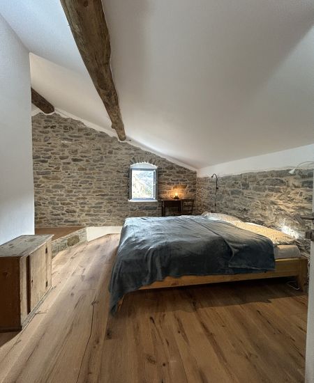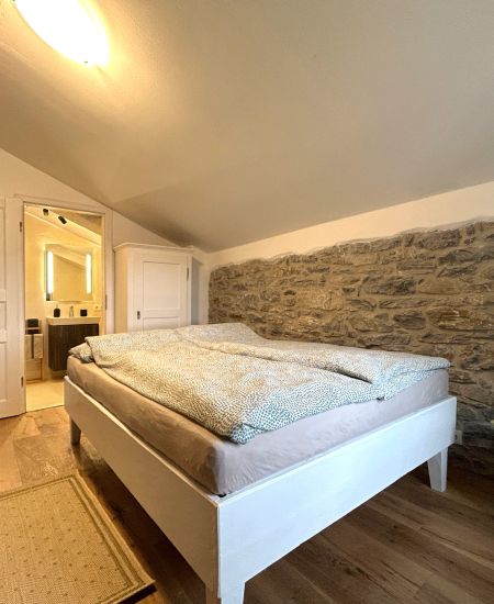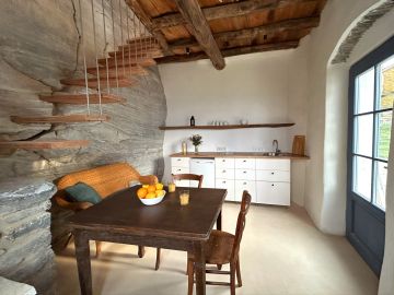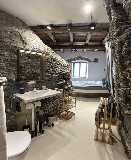 Das traditionelle Steinhaus grenzt an einer Seite an die natürliche Felswand. Das Bad ist ganz in den Fels hinein gebaut. Das ergibt ein ganz spektakuläres Wohngefühl und den Eindruck, mitten in der Natur zu sein.