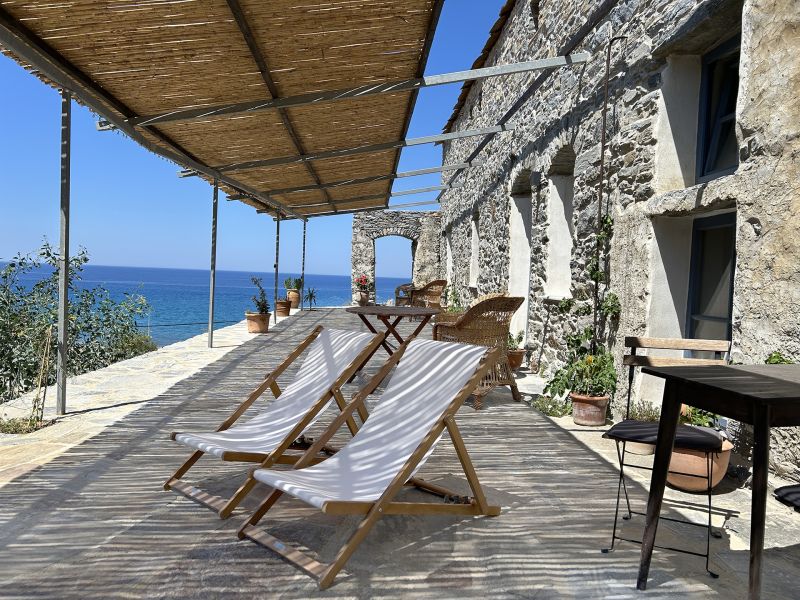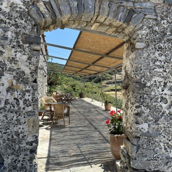 Η πέργκολα δημιουργεί ένα όμορφο σκιερό σημείο μπροστά από το σπίτι, ενώ μια άλλη βεράντα σκιάζεται από μια μεγάλη μπουκαμβίλια και μια συκιά. Οι φυσικοί πέτρινοι τοίχοι του σπιτιού, πάχους έως και ενός μέτρου, διατηρούν ευχάριστα δροσερό το εσωτερικό κατά τους καλοκαιρινούς μήνες, χάρη και στον φυσικό βράχο στο πίσω μέρος. Έτσι δεν είναι απαραίτητος ο κλιματισμός.