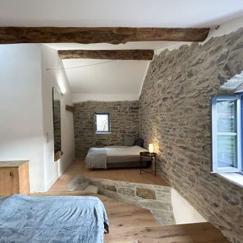 Στον επάνω όροφο, οι δύο χώροι ύπνου μπορούν να χωριστούν με κουρτίνα, προσφέροντας τόσο ανοιχτότητα όσο και ιδιωτικότητα.