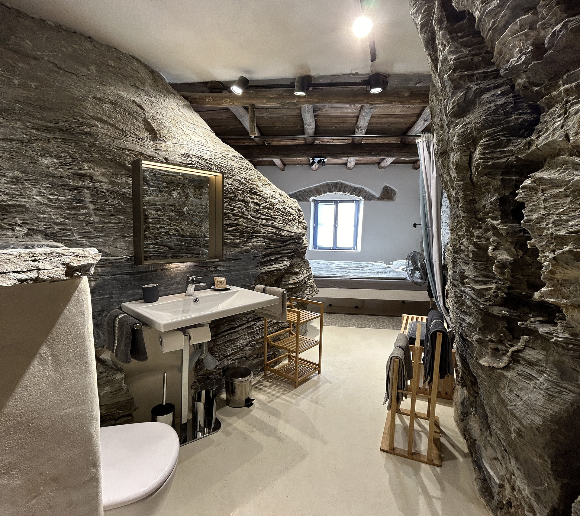 Das traditionelle Steinhaus grenzt an einer Seite an die natürliche Felswand. Das Bad ist ganz in den Fels hinein gebaut. Das ergibt ein ganz spektakuläres Wohngefühl und den Eindruck, mitten in der Natur zu sein. Die Terrasse hat eine wunderschöne Aussicht auf das Meer, den Strand von Fytema und die Berge von Messaria. Die Wohnung ist 2023 mit ökologischen Materialien im traditionellen Stil ausgebaut worden. Zum Strand sind es nur 200 m.