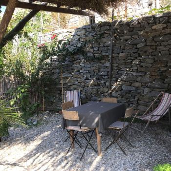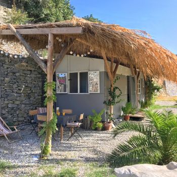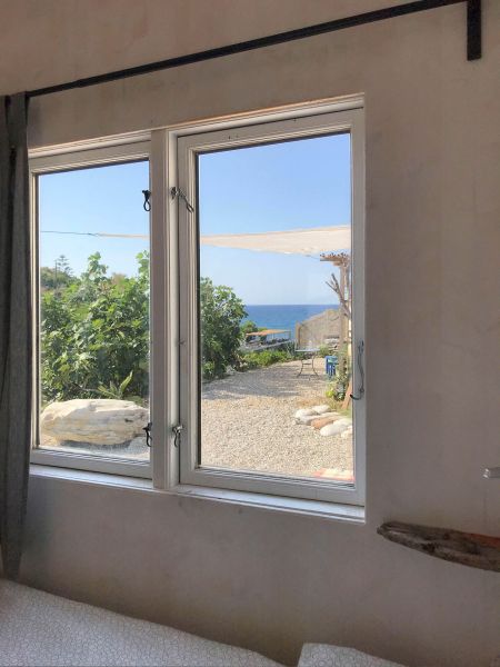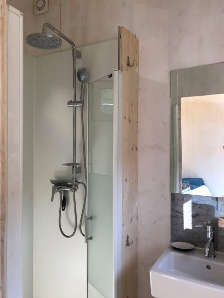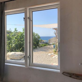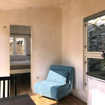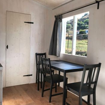 Our guests have access to a spacious private outdoor area surrounding the Tinyhouse. Right next to the tiny house, there is a seating area with sea views, as well as an additional outdoor shower. Fytema Beach can be reached in just a two-minute walk via our private access path.