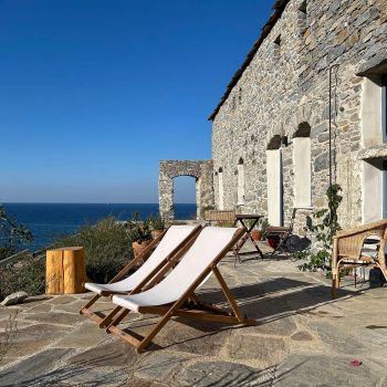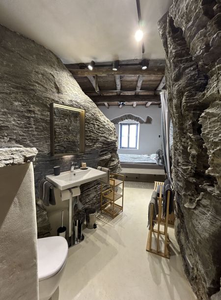 Das traditionelle Steinhaus grenzt an einer Seite an die natürliche Felswand. Das Bad ist ganz in den Fels hinein gebaut. Das ergibt ein ganz spektakuläres Wohngefühl und den Eindruck, mitten in der Natur zu sein. Die Terrasse hat eine wunderschöne Aussicht auf das Meer, den Strand von Fytema und die Berge von Messaria. Die Wohnung ist 2023 mit ökologischen Materialien im traditionellen Stil ausgebaut worden. Zum Strand sind es nur 200 m.